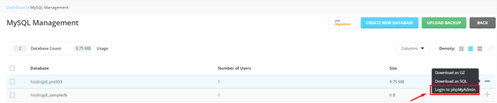 After enabling the one-click login feature of PhpMyAdmin, you can log in to the PhpMyAdmin from DirectAdmin panel without entering the login credentials as such of cPanel. To test, follow these steps: